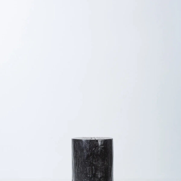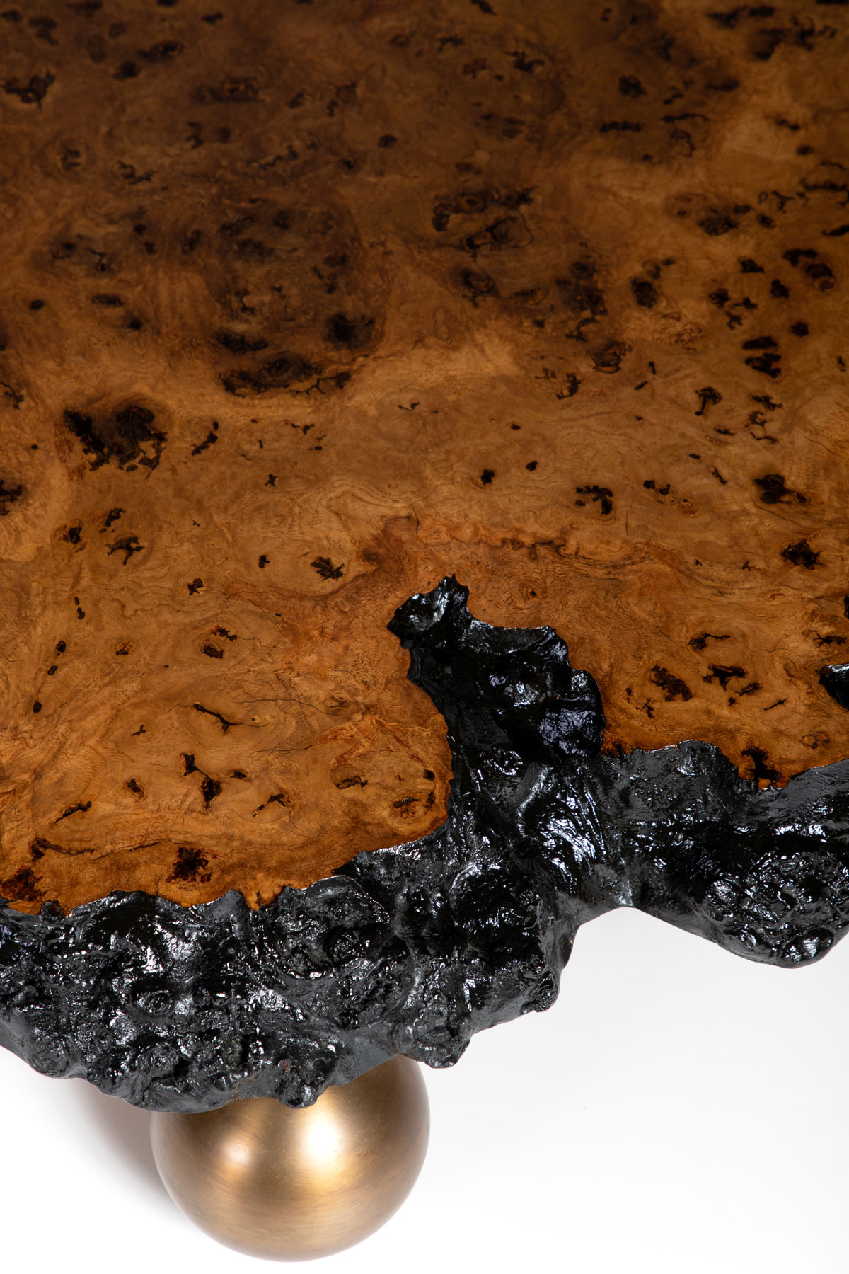 Coffe table ricavato da radica di quercia millenaria. Bordi finemente laccati neri effetto bruciato; siperficie trattata a mano con gomma lacca fusa e lucidata a specchio con olio fiorentino. Piedi con sfere in ottone brunito.
